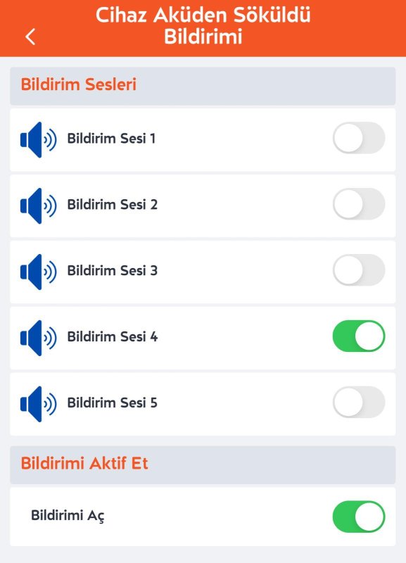 Bu bildirim kullanıcılara cihaz aküden söküldüğünde gönderilir. Bu bildimi almanız için cihazın uyku modunda olması gerekmektedir. Bu bölümde ayrıca özel bildirim seslerini seçebilirsiniz.(Bazı cep telefonları harici bildirim seslerini desteklememektedir). Bildirimi aktif ederek sol üst köşede yer alan ok(çıkış) işareti butonuna basarak bildirimi kaydetmeniz gerekir. Ayrıca kontak kapalı şekilde hareket algılama devam ettikçe bu bildirim tekrarlayacaktır.