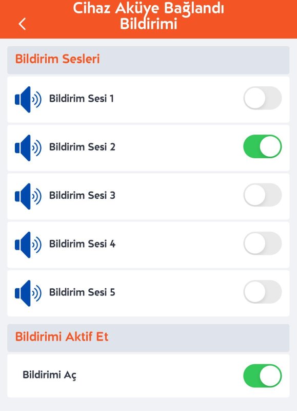 Bu bildirim kullanıcılara cihaz yeniden aküye bağlandığında gönderilir. Bu bölümde ayrıca özel bildirim seslerini seçebilirsiniz.(Bazı cep telefonları harici bildirim seslerini desteklememektedir). Bildirimi aktif ederek sol üst köşede yer alan ok(çıkış) işareti butonuna basarak bildirimi kaydetmeniz gerekir. Ayrıca kontak kapalı şekilde hareket algılama devam ettikçe bu bildirim tekrarlayacaktır.
