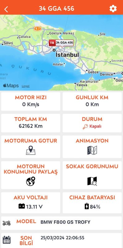 Bu alana ana giriş ekranında ki plaka bilgilerinin yazdığını beyaz butona tıklayarak ulaşabilirsiniz. Birden fazla motosikletiniz olsa bile seçtiğiniz bir plakaya tıklayarak sadece o plaka özelinde ayarlamalar ve önizlemeler yapabilirsiniz. Bu alanda yer alan başlıca özellikler Motoruma Götür, Animasyon, Motorun Konumunu Paylaş ve Sokak Görünümü yer alır. Ayrıca sağ üst köşede yer alan Ayarlar butonundan seçtiğiniz plakaya ait Bildirim Ayarları Merkezine ulaşabilirsiniz. Bildirim ayarları hakkında Detaylı Bilgi için Buraya Tıklayınız