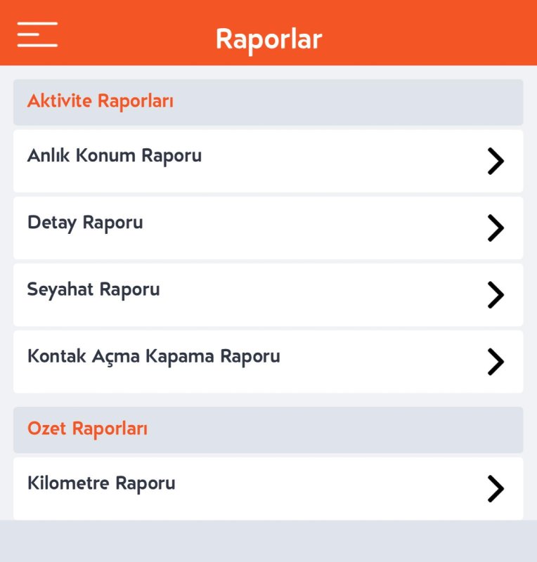 Bu bölümde cihazdan gelen raporları görmektesiniz. Bunlar Anlık Konum Raporu, Detay Raporu, Seyahat Raporu, Kontak Açma Kapama Raporu ve Kilometre Raporu' dur.